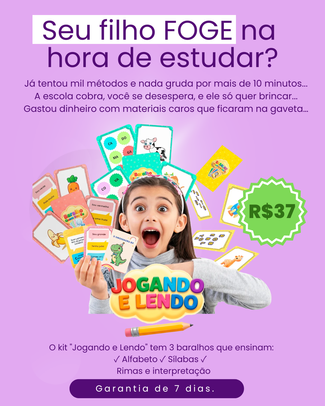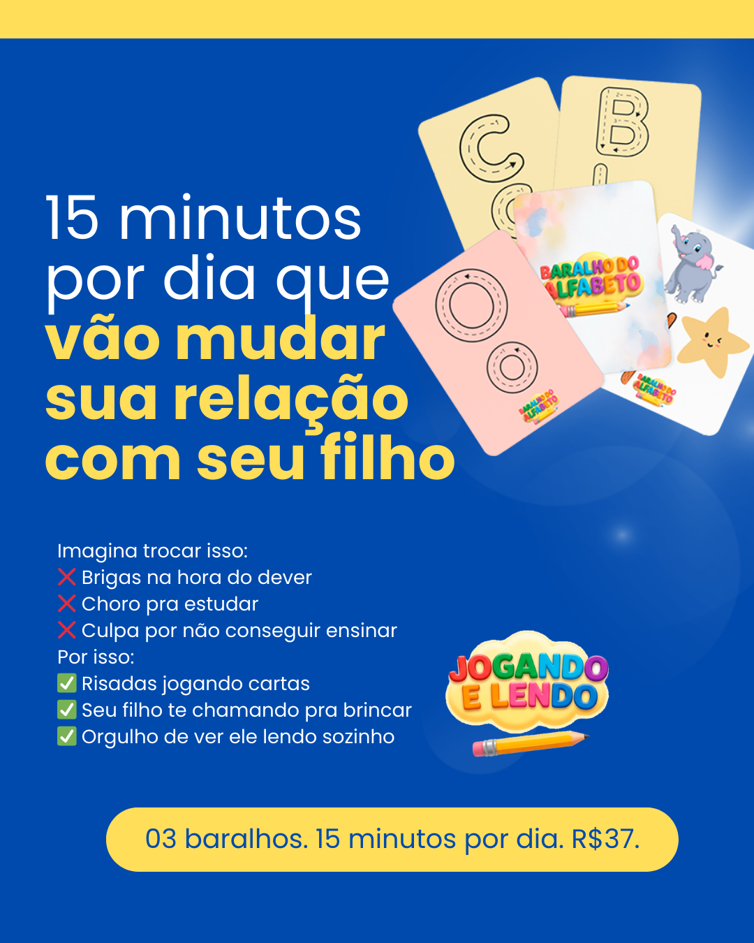 BARALHO DO ALFABETO Imagina trocar isso: ❌ Brigas na hora do dever ❌ Choro pra estudar ❌ Culpa por não conseguir ensinar Por isso: ✅ Risadas jogando cartas ✅ Seu filho te chamando pra brincar ✅ Orgulho de ver ele lendo sozinho